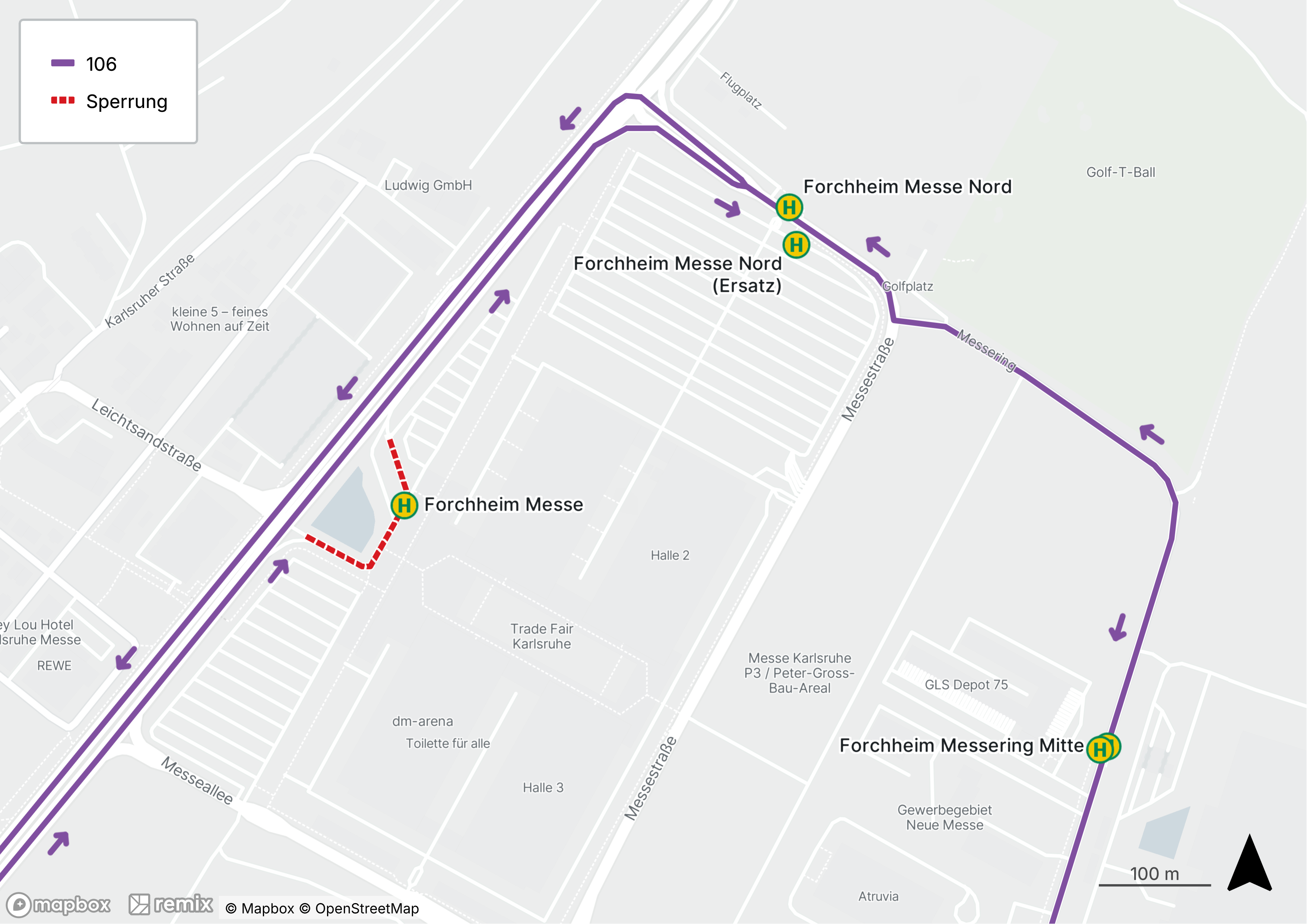 die Haltestelle "Forchheim Messe" in Fahrtrichtung Ettlingen nicht bedienen. Die Busse halten in dieser Zeit ersatzweise an einer Ersatzhaltestelle "Messe Nord" in der Messestraße in Höhe der Parkplatzausfahrt/Radwegquerung (gegenüber der Bestandshaltestelle in Richtung Neuburgweier).