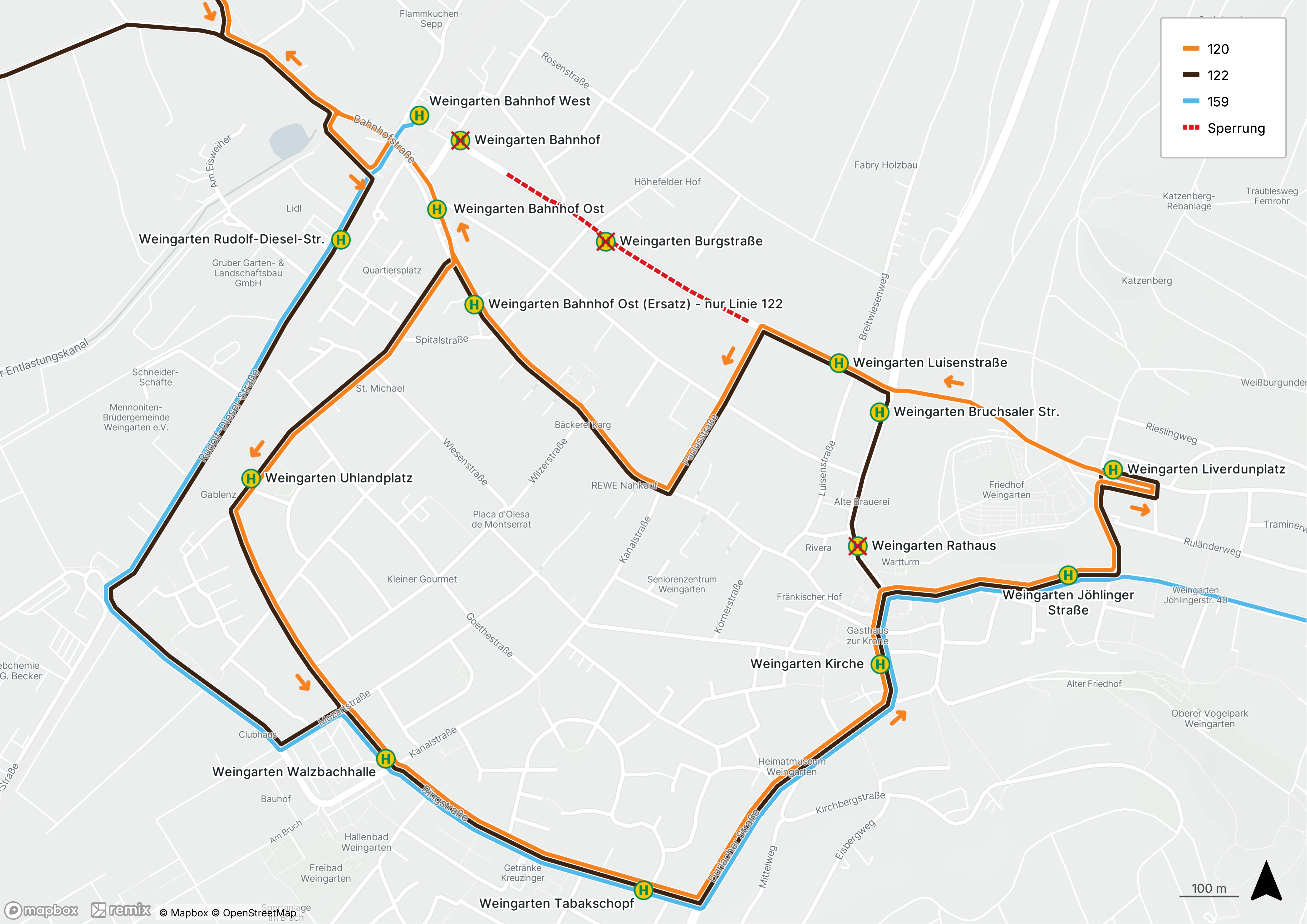Linie 120: Die Haltestellen "Weingarten Burgstraße" und "Weingarten Bahnhof" können nicht bedient werden. Ersatzweise halten die Busse an der Haltestelle "Weingarten Bahnhof Ost".