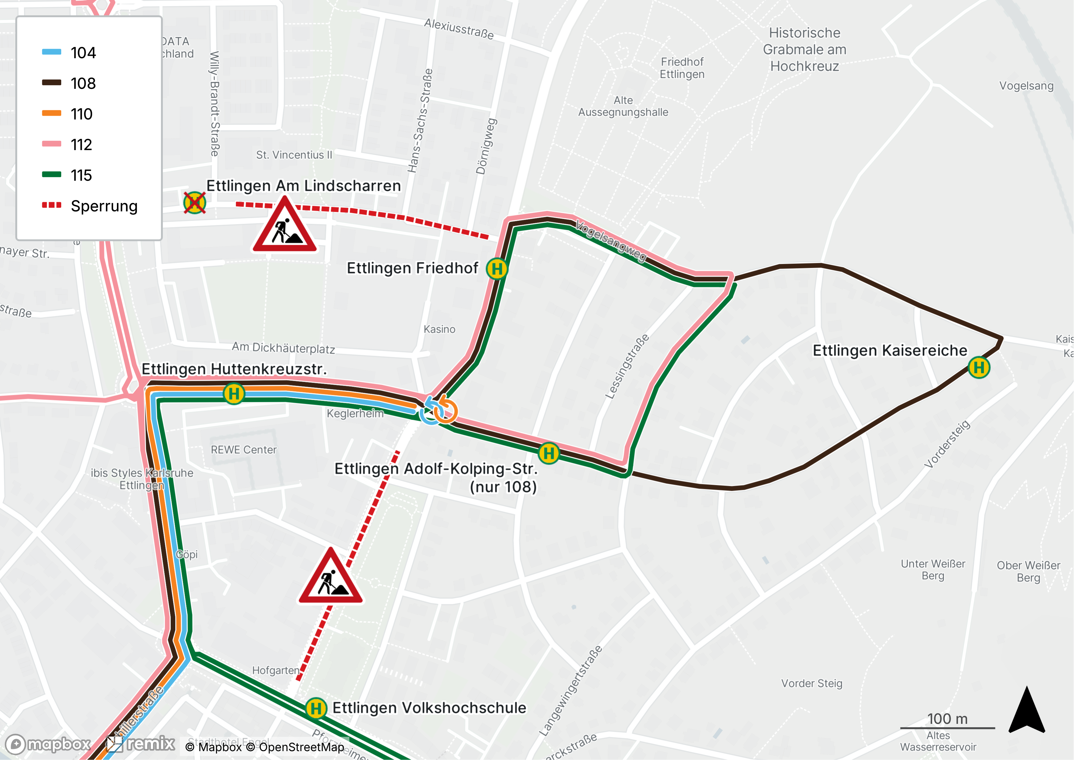(eic) Aufgrund von Baumaßnahmen in der Gutleuthausstraße in Ettlingen können die Linien 108, 110, 112 und 115