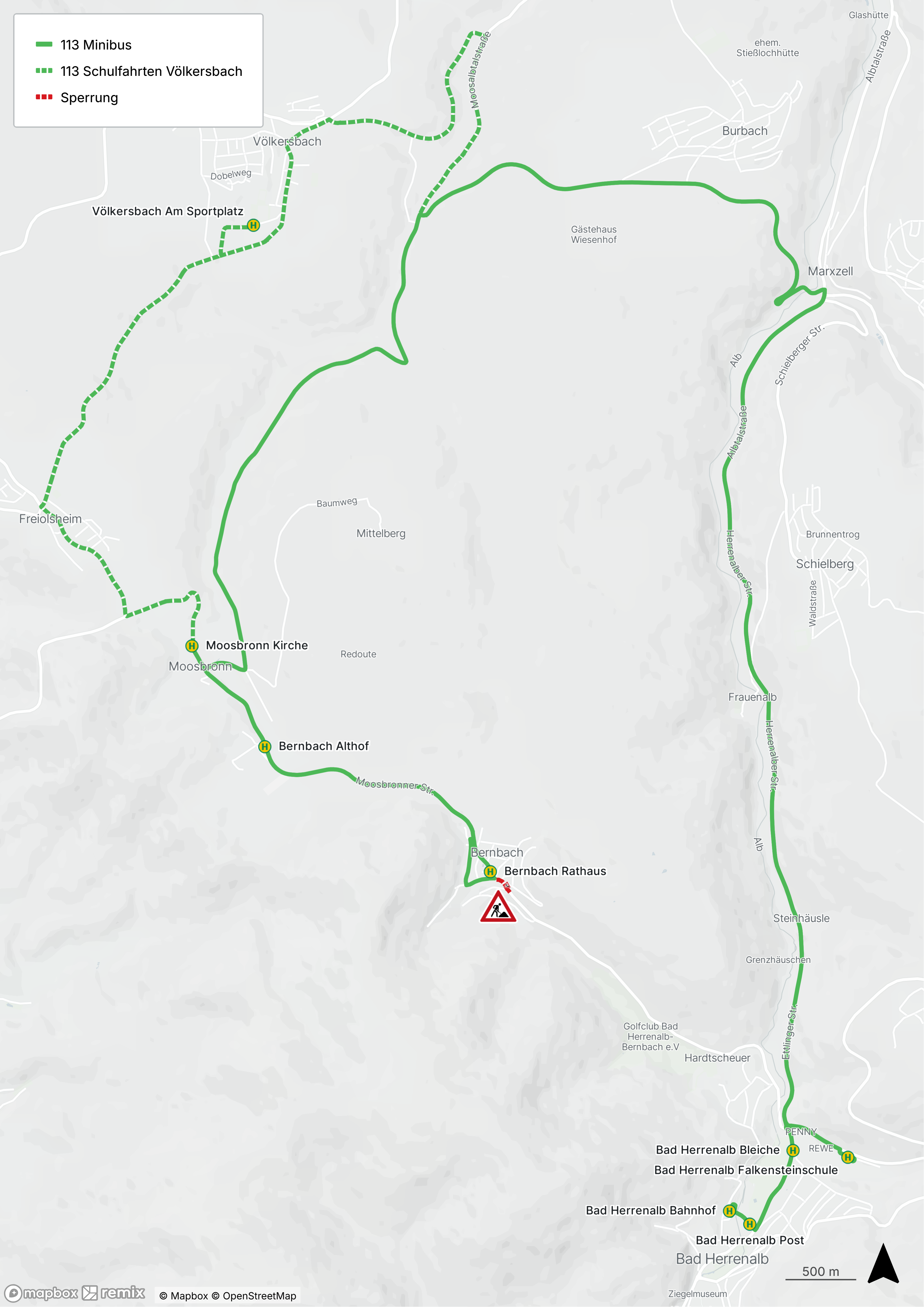 Ab dem 24.11.2025 gilt daher ein vollständig geänderter und eingeschränkter Baustellenfahrplan auf der Linie 113. Die Busse fahren in dieser Zeit in Bernbach jeweils ausschließlich von der Haltestelle auf der Seite am Rathaus/Kindergarten ab. Die Haltestelle auf der gegenüberliegenden Seite bei der Feuerwehr wird nicht bedient und ist aufgehoben. Zur Sicherstellung des Schulverkehrs zu den Schulen in Ettlingen und Karlsruhe verkehren einzelne Fahrten von/nach Völkersbach zur Haltestelle „Völkersbach Am Sportplatz“. Dort besteht eine Umsteigemöglichkeit auf die Busse der Linie 101 (Völkersbach – Schöllbronn – Spessart – Ettlingen), sodass sich die zeitlichen Verluste bei einer Umleitung nach Bad Herrenalb reduzieren lassen. Der Verkehr von/zur Falkensteinschule muss über die weiträumige Umleitungsstrecke abgewickelt werden. Aus Kapazitätsgründen wird jeweils am Morgen und am Mittag eine Kurzfahrt von/zur Haltestelle „Bernbach Talblickstraße“ angeboten. Die schulischen Verkehre der Relation Bernbach <> Gernsbach können in dieser Bauphase nicht abgebildet werden bzw. sind nur mit deutlich längerer Fahrzeit über Moosbronn und Gaggenau möglich.