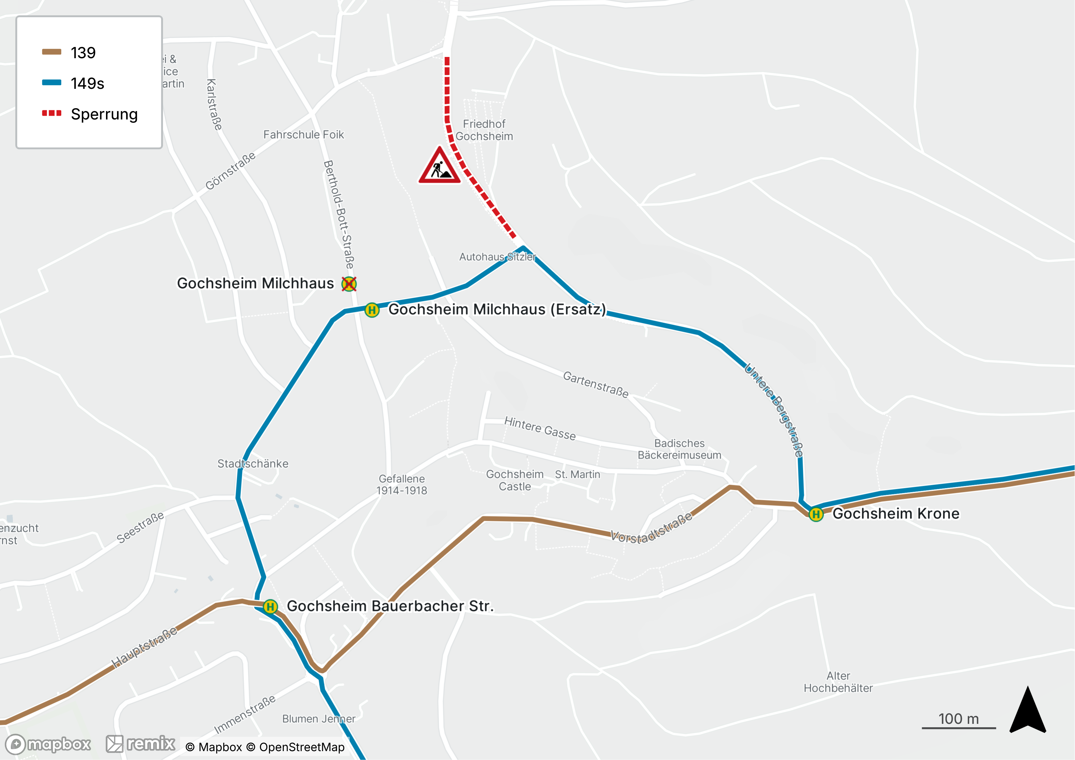innerörtlich umgeleitet werden. Die Haltestelle "Gochsheim Milchhaus" wird daher mit einer Ersatzhaltestelle auf Höhe Wilhelmstraße 1 verlegt.