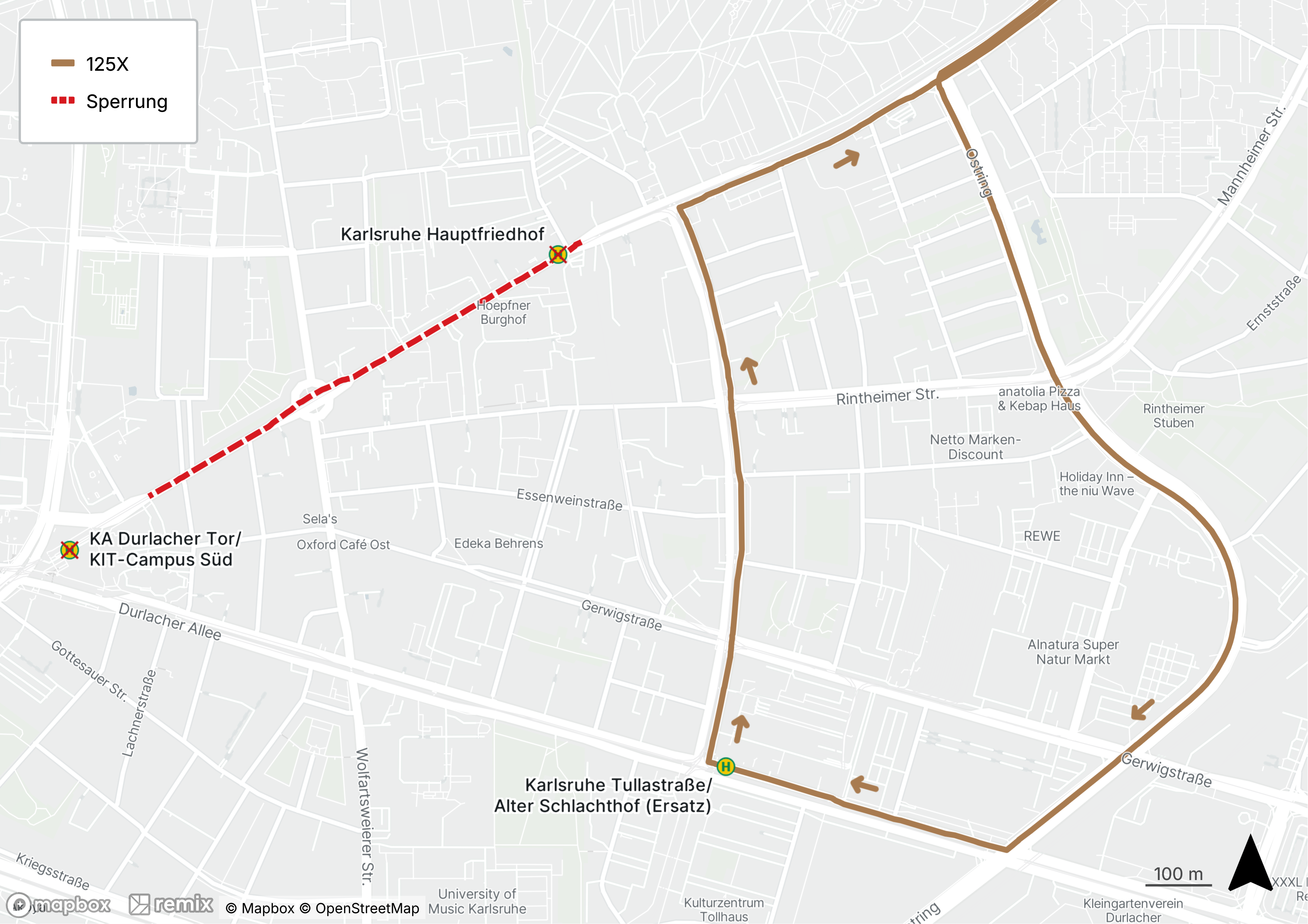 innerörtlich umgeleitet werden. In der Folge kann die Linie 125X im betroffenen Zeitraum die Haltestellen "Karlsruhe Hauptfriedhof" und "Karlsruhe Durlacher Tor/KIT-Campus Süd" nicht bedienen. Die Busse halten ersatzweise an einer Ersatzhaltestelle in der Durlacher Allee in Höhe der regulären Haltestelle "Tullastraße/Alter Schlachthof".