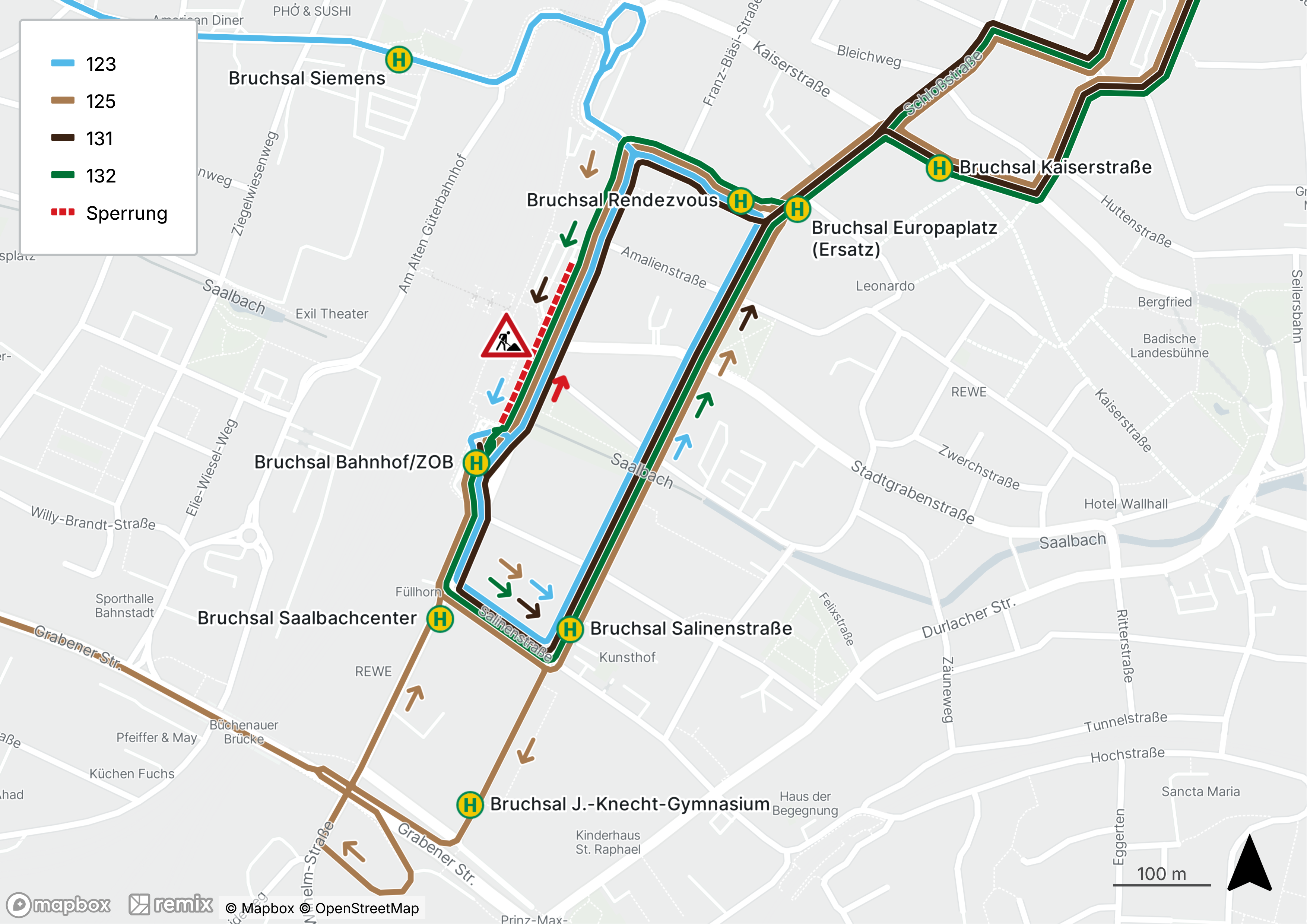 (eic) Aufgrund von Baumaßnahmen am Bahnhofsvorplatz in Bruchsal müssen die Linien 123, 125, 125s, 125X, 131 und 132