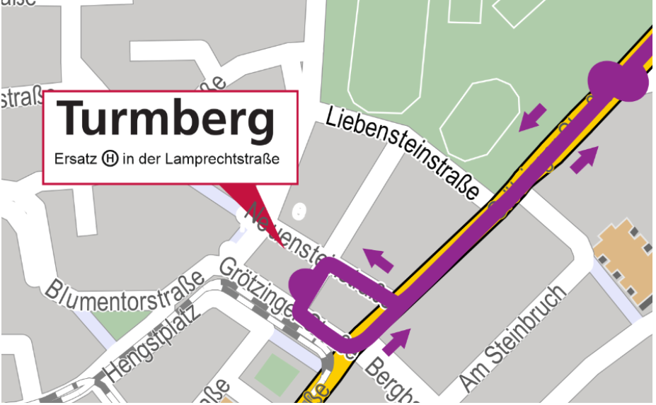 Die Haltestelle Durlach Turmberg wird in diesem Zeitraum in die Lamprechtstraße verlegt.