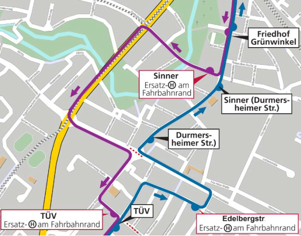Die Haltestelle "St. Josef Kirche" (beide Fahrtrichtungen) sowie die Haltestelle "Durmersheimer Straße" (Richtung Hauptbahnhof) sind aufgehoben.