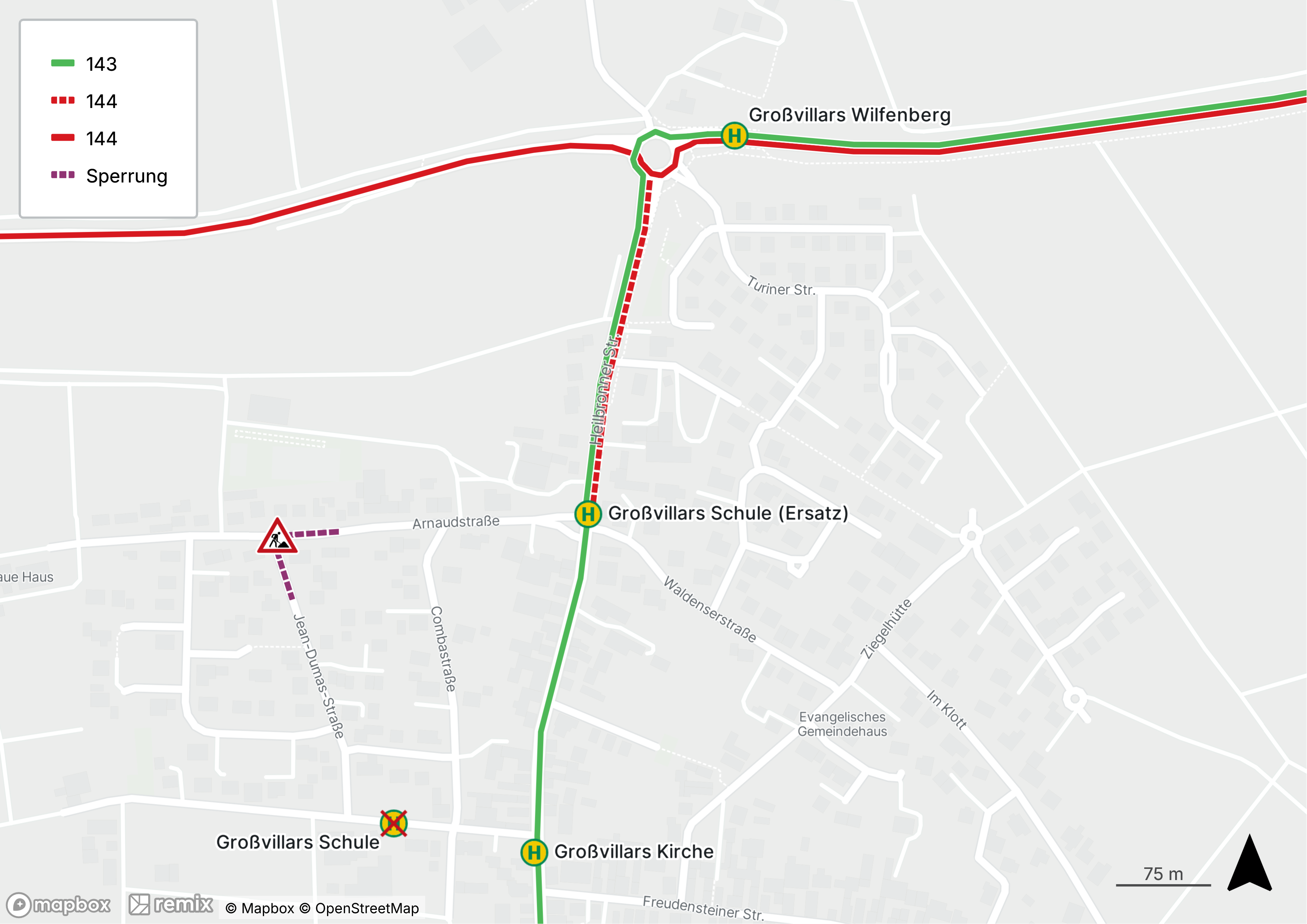 für die Schulfahrten der Linien 143 und 144 mit einer Ersatzhaltestelle (Kreuzungsbereich Heilbronner Straße / Arnaudstraße) verlegt werden. Alternativ kann für die morgendlichen Schulfahrten der Linie 143 die Haltestelle "Großvillars Kirche" genutzt werden.