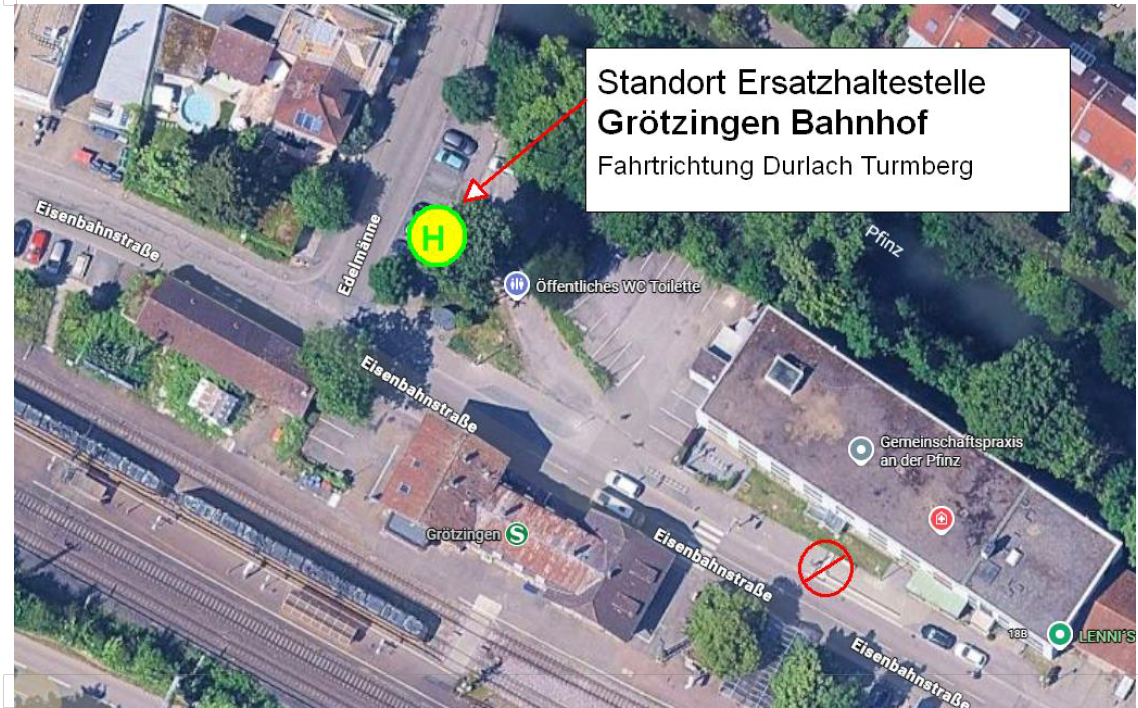 wird die Haltestelle "Grötzingen Bahnhof" (in Fahrtrichtung Durlach Turmberg) um ca. 50m in die Straße Edelmänne verlegt.