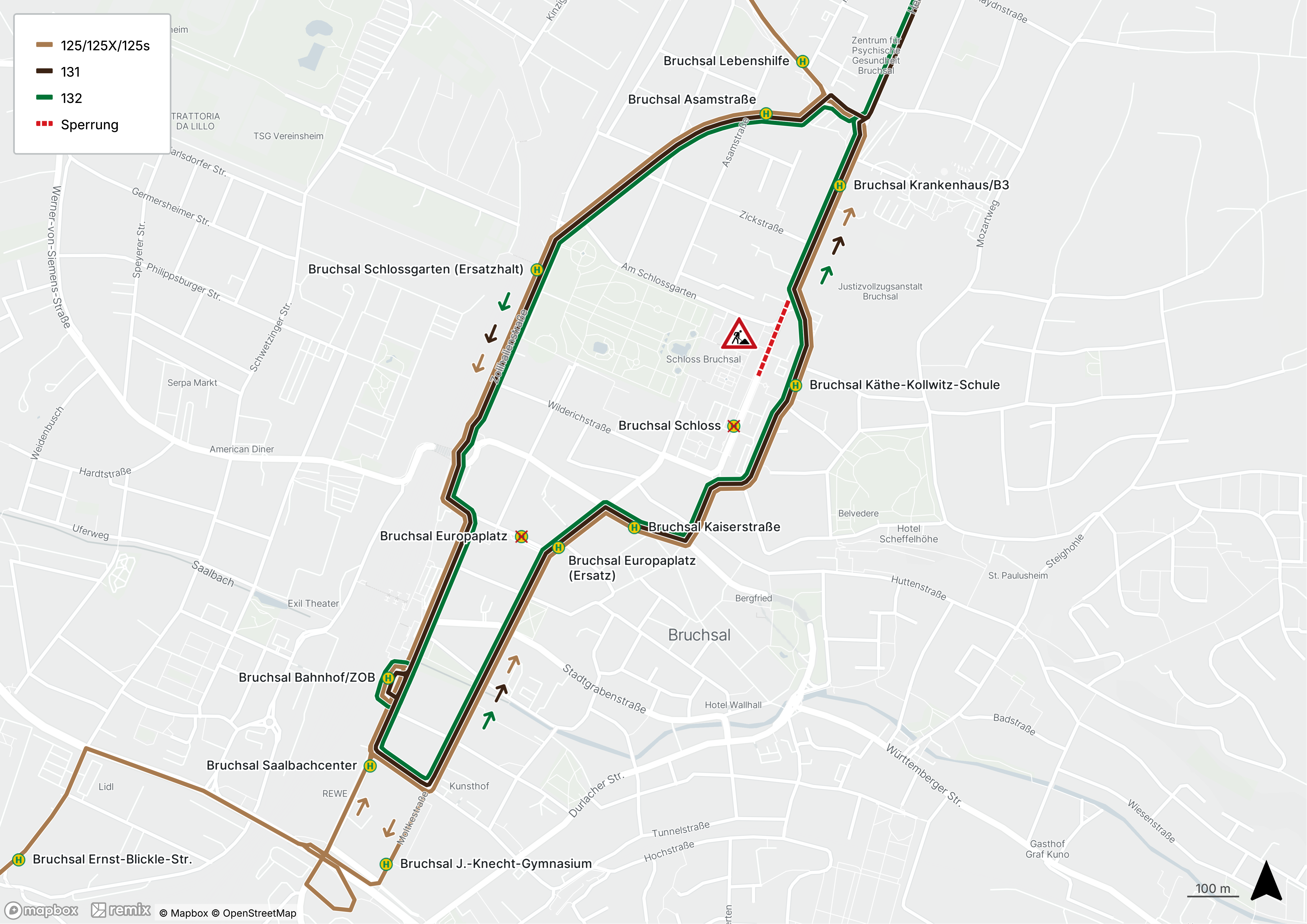 Die Busse bedienen ersatzweise die Haltestelle "Bruchsal Asamstraße" sowie eine Ersatzhaltestelle in der Zollhallenstraße in Höhe des Schlossgartens. Die Fahrten in Richtung Ubstadt und Forst sind nicht betroffen und verkehren regulär.