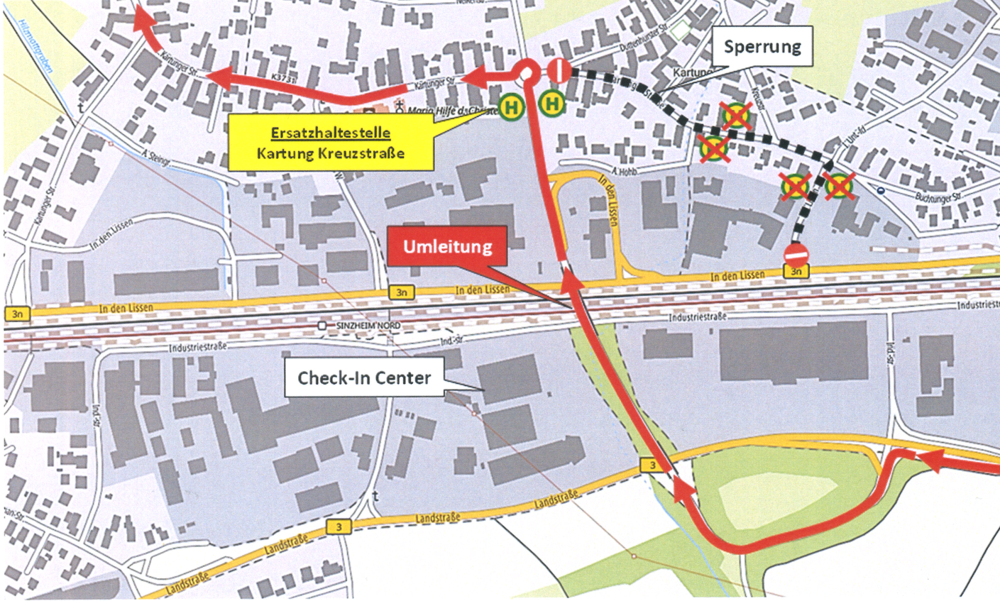 - Umleitungsverlauf: ab Haltestelle Königsberger Straße über die Sinzheimer Straße - B3 - Brücke (Höhe OBI-Center) - K3731 und weiter über die reguläre Strecke